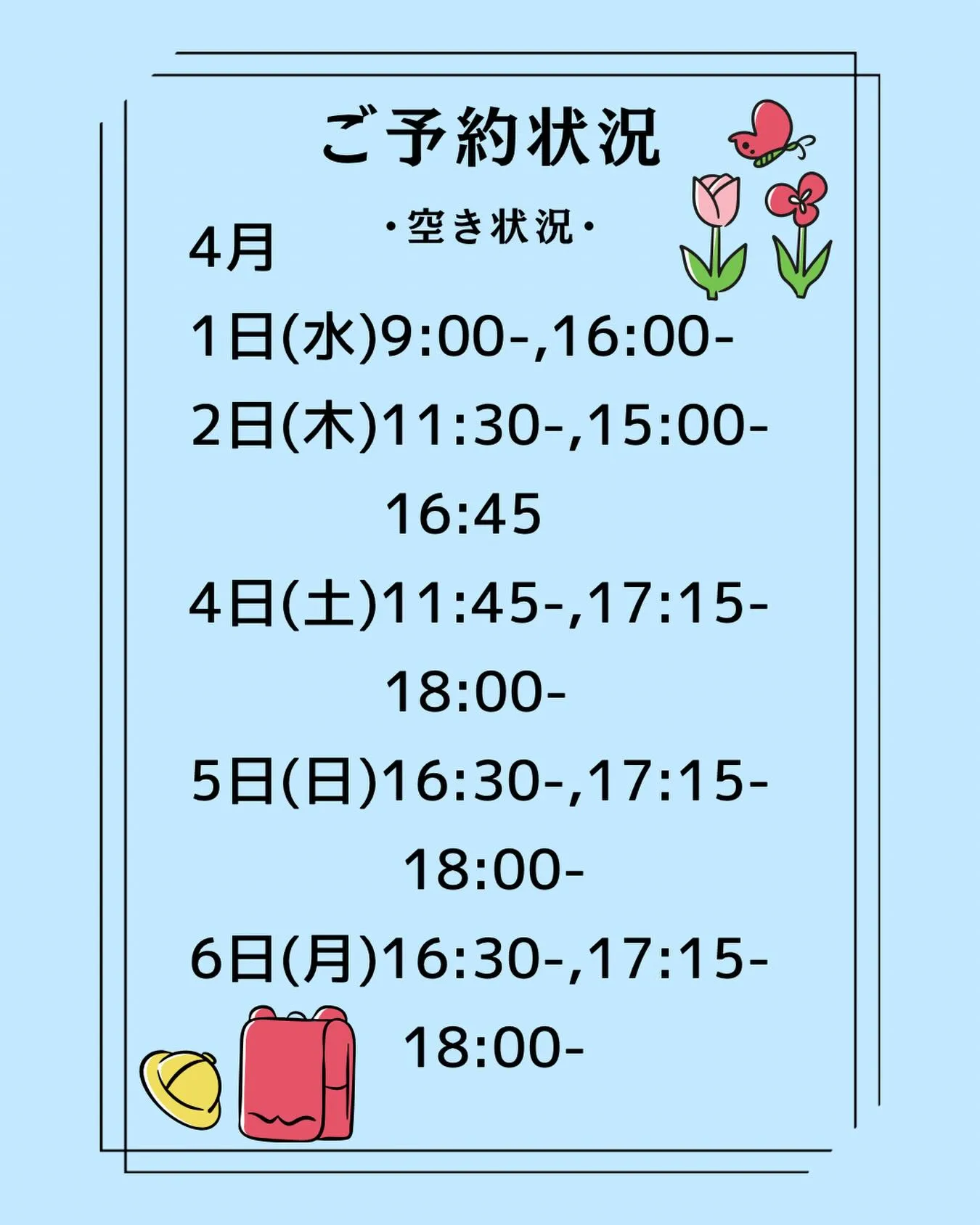 こんにちは!4月の空き状況のお知らせです。